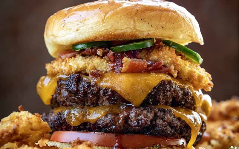 برجر روديو رجالي أصيل مع شريحة لحم بقري عصارية، بيكون مقرمش، جبنة شيدر، مخلل خيار، خس طازج وصوص خاص. يقدم