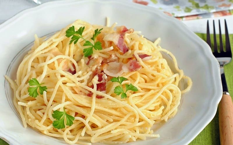 باستا كاربونارا كريمية حسب الوصفة الإيطالية الكلاسيكية: سباغيتي، بانشيتا أو بيكون مقلي، صفار بيض، جبنة بارميزان وفلفل أسود. هذا طبق